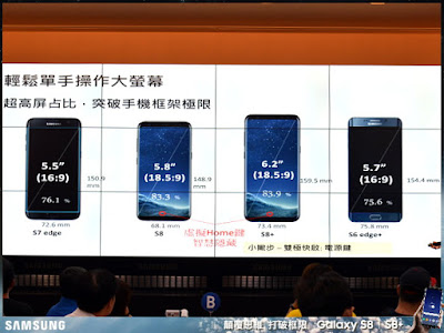 首次採用虛擬 Home 鍵設計,還有螢幕比例也設計成 18.5:9,讓 5.8 吋的 Galaxy S8 以及 6.2 吋的 Galaxy S8+ 螢幕看起來特別大,但與前幾代 S7 edge 及 S6 edge 旗艦機相比,機身大小並不會大很多。